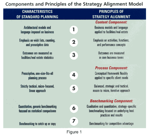 The focus of this article is on the Strategy Alignment Process Component, which offers a straightforward methodological framework for the collection, analysis, synthesis and communication of information in virtually any planning situation. A third article will introduce the Benchmarking Component as a tool for incorporating real estate best practices that help companies achieve competitive advantage.