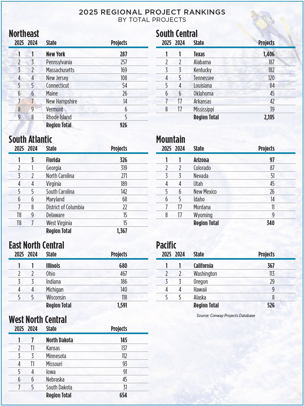 At No. 4, California and its 367 projects complete a repeat top four states, while Florida (326 projects) jumps up to No. 5 from No. 7 in 2024. This year Virginia jumps from No. 14 to No. 10 with 189 projects.