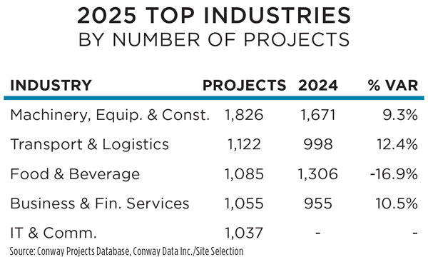 Movement throughout the world’s top industries in 2025 reflects the intricate Western shift in new corporate site selection strategies. By quantity of new facility location and expansion projects qualified for Site Selection’s Conway Projects Database, Machinery, Equipment & Construction remains the global industry leader for the ninth consecutive year. With 1,826 total projects, 1,214 of which were fresh facility announcements, the industry experienced a 9.3% increase over the year prior.