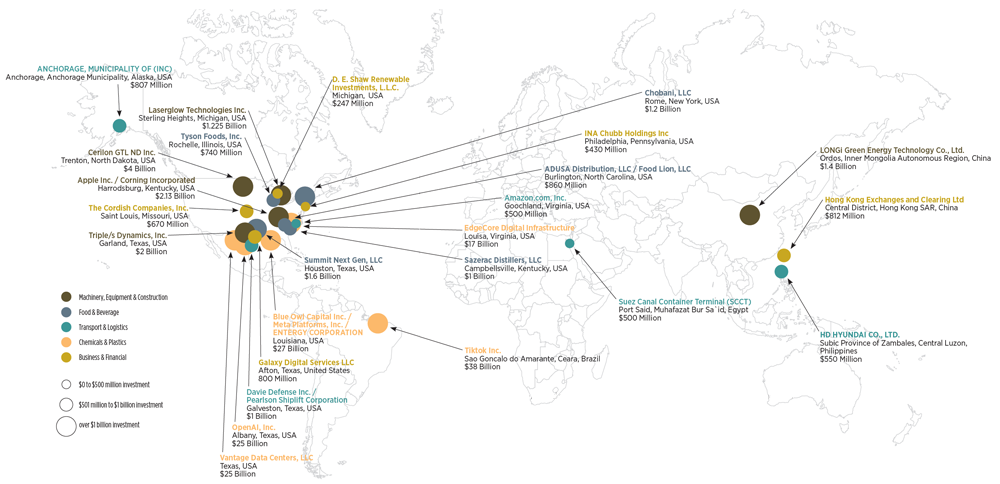 We gathered data on the top 15 projects by capital investment from each leading industry — the U.S. secured 44 of 75 total projects. Projects spread throughout the map highlight the preferred global location for major investments announced throughout 2025. For insight into a few heavy hitters on board: