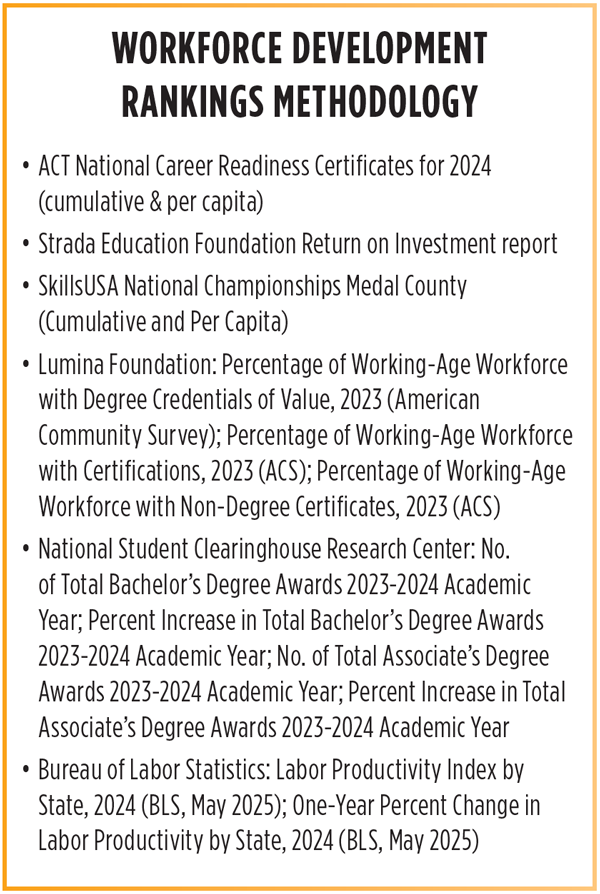 Site Selection rankings published throughout the year use the publication’s Conway Projects Database of corporate end-user facility investment projects to take the measure of regional economic development agencies. So it only makes sense that any measure of state workforce development take into account that workforce’s prowess, whether measured by credentials, certificates and degrees; technical skills and productivity; or something equally important to employee and employer alike: return on investment.