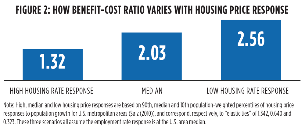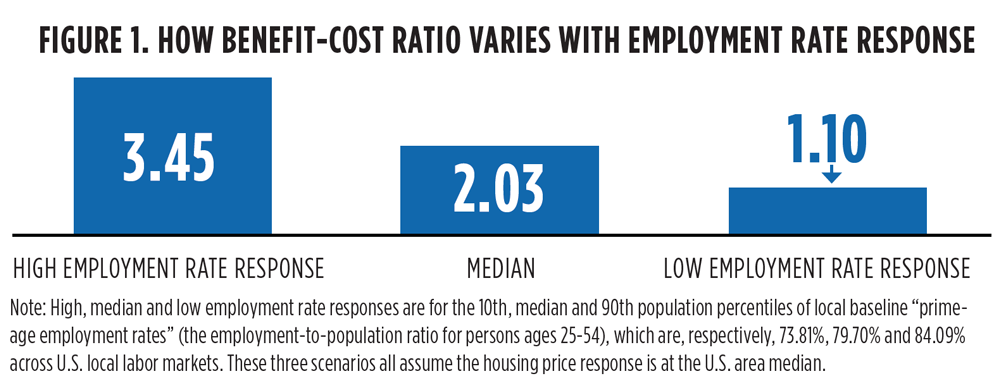 Figure 2 shows the analogous comparison for the housing price sensitivity scenarios. If housing prices are highly sensitive to population growth (in places where housing is hard to build, for example), the benefit-cost ratio is only 1.32. Higher housing prices drive up local business costs, which suppresses jobs in other local businesses. Property owners gain, but local workers only get scant benefits. In contrast, if the area’s housing prices are less sensitive to population growth (it’s easier to build housing), the benefit cost ratio almost doubles, to 2.56.