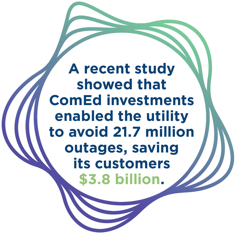 ComEd recently filed its four-year grid plan, focusing on sustaining reliability, maintaining affordability and adapting to rising energy demand. “It ensures continued reliability of the grid for the nine million residents of Northern Illinois that we serve,” says Quiniones. “We have reduced outages.” A recent study showed that ComEd investments enabled the utility to avoid 21.7 million outages, saving its customers $3.8 billion.