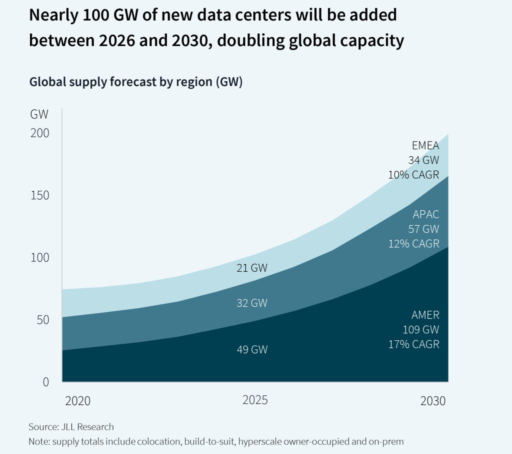 All of which makes it a perfect time to check in with the data center experts at JLL, which in January released its 2026 Global Data Center Outlook. The report projects that global data center capacity will nearly double from 103 GW to 200 GW by 2030, requiring up to $3 trillion in total investment over the next five years, including $1.2 trillion in real estate asset value creation and approximately $870 billion in new debt financing, marking “an infrastructure investment supercycle.”