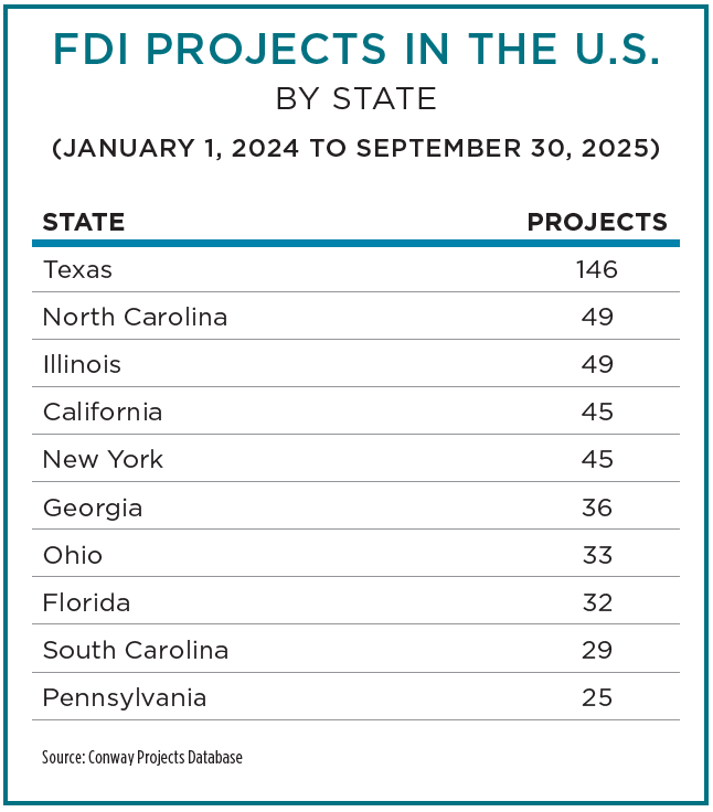 Tracking U.S. investment projects of foreign origin in Site Selection’s Conway Data Projects Database from January 1, 2024, to September 30, 2025, shows Canada, the UK, Germany, Japan and Switzerland to be the top countries of origin in that order. Projects qualify to be in the database if they involve facility construction/expansion and involve at least $1 million invested, 20 new jobs created or 20,000 new sq. ft. of space.