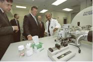 Gov. Tom Ridge (center) sees the laboratory in action at Merck & Co. "Pittsburgh has always been seen as a location for the chip-design industry, but with the announcement last July of the establishment of the Sony Electronics Semiconductor Design Center, the area will now be seen by the industry as a natural location to house design centers," says Tunnell. "Other chip designers are taking notice of the Sony announcement. As a result, Pittsburgh is well on its way to reaching 1,500 chip-design jobs by 2005. The wages for these jobs are typically $50,000 to more than $100,000 per year. The PDG plays a pivotal role in talent recruitment." In addition to chip designers, Pittsburgh attracts a bevy of information technology talent. On May 1, Gov. Ridge announced that Laurel Networks, a developer of high-capacity network-routing systems, planned to open a new headquarters to support its expansion in Pittsburgh and create 170 new jobs over the next few years.