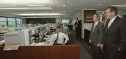 Gov. Ridge (far right) gets a tour of The Vanguard Group's corporate headquarters in Malvern, Pa. The company is planning a 6,000-employee expansion in the near future. "Pittsburgh's business climate, combined with the support of Gov. Ridge and his economic development team, is helping to lift Laurel Networks onto the product-development fast track," says Atul Bansal, CEO for Laurel. "Since we've partnered with the Commonwealth, our expansion has progressed nicely. Our staff is growing, we've secured additional funding, and now we've opened our new headquarters in a premier Pittsburgh corporate center." The new 30,000-sq.-ft. (2,790-sq.-m.) headquarters on the campus of the Omega Corporate Center will house the company's offices, laboratories and customer briefing center. It will also serve as the center for design, development and prototyping of Laurel's networking products.
