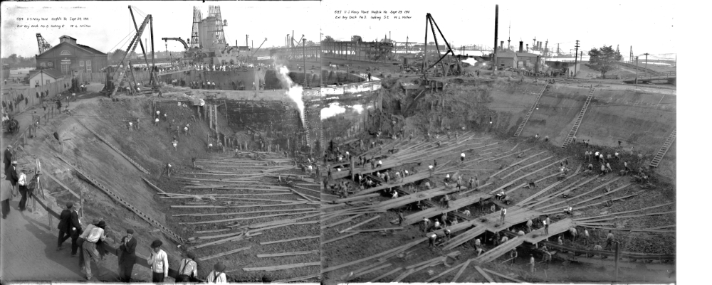 The legacy of workforce development at Norfolk Naval Shipyard goes back generations, from visiting Naval Research Enterprise interns today to World War II veterans learning drafting skills in 1945 and the construction of the drydock itself in 1910 (opposite).