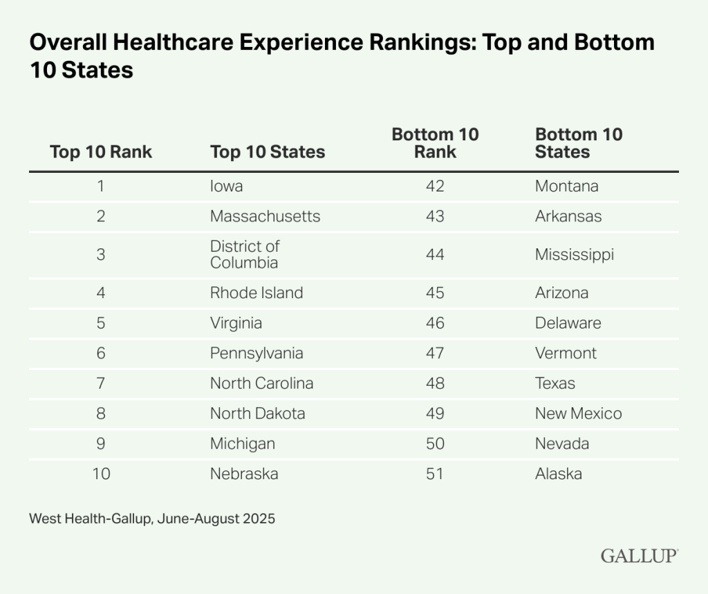 The “State of the States 2025: Insights on Healthcare in America” study from Gallup and West Health ranks each state’s performance for its residents’ overall health care experiences, derived from responses to 27 questions answered by nearly 20,000 Americans. The launch of the report this week coincides with the launch of the new Center on Healthcare in America by Gallup and West Health, which offers 20 years of data on the American health care experience. (Site Selection follows AP style, which calls for health care to be written as two words except when part of a proper noun. — Ed.)