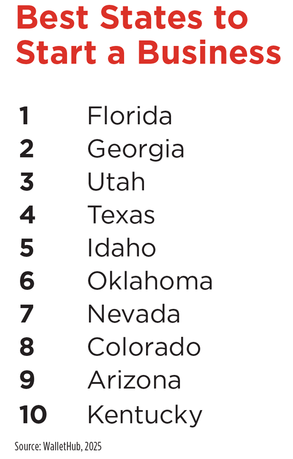 According to research conducted by WalletHub, “where you start your business is one of the most essential pieces of the puzzle.” When WalletHub produced its 2025 ranking of the Best States to Start a Business, considering factors such as business climate, business costs and access to capital, Florida placed first, followed by Georgia, Utah, Texas and Idaho. Kentucky ranked No. 10, and Virginia ranked No. 38.