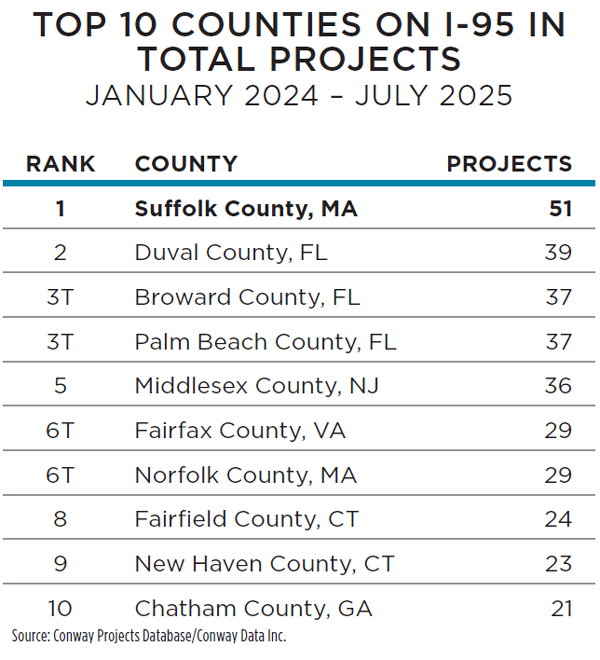 An analysis of the Conway Projects Database bears this out. Suffolk County, Massachusetts, leads all counties along I-95 in total corporate facility projects gained since the beginning of 2024. Over an 18-month timeframe, this Boston area county tallied 51 projects that meet the criteria to be included in the official project database of Conway Data Inc. and Site Selection magazine.