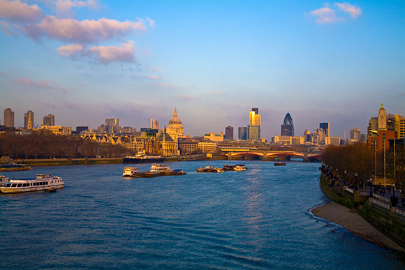 An early evening view of London’s South Bank and city skyline, from Waterloo Bridge