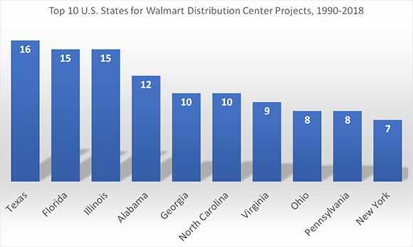 Of the 232 Walmart facility investment projects Conway Analytics has tracked over the past quarter-century, 190 (nearly 82 percent) have been distribution centers. Precise figures aren’t always released, but total figures from those for which we have details add up to a cumulative $4.4 billion invested, more than 52,900 jobs created and more than 96 million sq. ft. of space. The chart shows top U.S. states for Walmart distribution center projects over that span — a remarkable number of which have been incremental expansions over the years. In 2014, Site Selection reported on Walmart’s logistics footprint and location strategy.