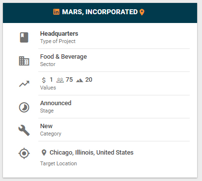Project: In September 2017, the Mars Food business unit announced the opening of new North American headquarters in Chicago. The new office created 75 jobs and occupies 20,000 sq. ft. Mars Food focuses on pet care products, chocolate and a range of food products. Mars, Inc. has $33 billion in sales and 75,000 employees around the world.