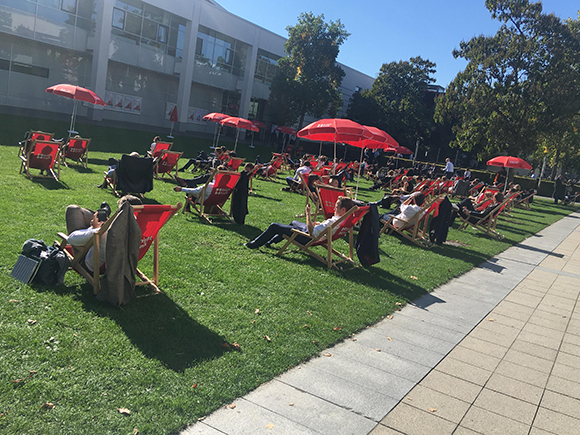 Laura Martin, market development manager for Conway, Inc., made this photo of Expo Real attendees this week finding a moment to relax in the sun or under parasols near the conference site in Munich. Themed around risk, the digital revolution and affordable housing, the annual property and investment conference this year set a record with 2,095 exhibitors from 41 countries, and participants totaled 44,536 from 72 countries. |