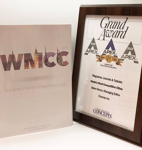 This striking cover design by Negin Momtaz is just the beginning of the excellent analysis, data and graphics you’ll find in Conway’s just-published 2018 World’s Most Competitive Cities report, now available in digital edition. The 2017 edition of the report won an APEX Grand Award (below) from Communications Concepts.