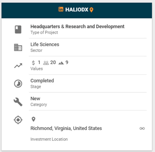 In March 2019, HalioDx announced the completion of a $1-million-plus investment in a new U.S. headquarters, laboratory and sales operation in Richmond, Virginia. The investment creates 20 new jobs.