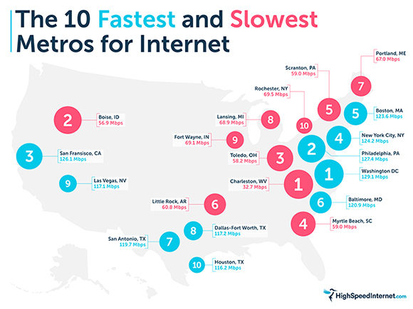 HighSpeedInternet.com’s latest report names the 10 fastest and slowest U.S. metros for internet speeds,” from among the 100 largest metros nationwide. Among the findings: Washington D.C. was fastest (129.1 Mbps); Charleston, West Virginia was slowest (32.7 Mbps); and median average download speeds in New York City increased over 20 Mbps within the last year. |