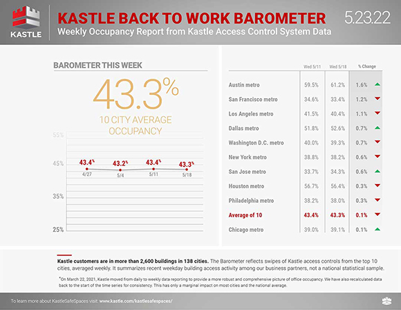 The graphic above from Kastle Systems shows those 10 cities’ office