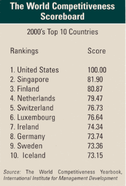 In the meantime, things are good, particularly in the USA, which is enjoying the longest period of economic expansion since World War II. The USA again ranks number one in the International Institute for Management Development’s annual World Competitiveness Yearbook Scoreboard (see chart). Whereas deregulation drove economic expansion in the early 1990s, New Economy factors are the catalyst now. “The USA is a pioneer in the Internet economy,” says Prof. Stephane Garelli, director of the World Competitiveness Yearbook project. “In 2003, an estimated 10 percent of the U.S. GDP will be generated on the Internet.”