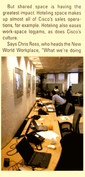 In contrast to Cisco’s expansion juggernaut, the company’s Net-centric business model pares back some space requirements. With that model, a whopping 97 percent of business orders come over the Net. Consequently, Cisco can immediately check demand; and it can close its quarterly books in a single day. To great extent, the network is Cisco, a virtually integrated outside-in prototype. What the rest of the world sees as one company is, in fact, a networked conglomeration of Cisco and its far-ranging constellation of assemblers, contract manufacturers and suppliers. That model has huge real estate ramifications. Cisco, for example, can continually ramp up output without building a single plant. It doesn’t even touch 70 percent of its products. Instead, contractors using Cisco’s intranet directly monitor, fill and ship customers’ orders. That online integration has continually compressed order and product development cycles while appreciably increasing customer satisfaction. Similarly, Cisco’s real estate/workplace group is regarded as a cyberspace leader. The group, though, seems to mirror CEO Chambers’ policy of normal, healthy paranoia. We’re always our own worst critic, but we don’t think we’re far enough ahead, says Garvey. We want to not just put processes online, but to think about the best way to get the job done two or three years down the road. But when I go out and do public speaking, the audience feedback always makes me realize that, gee, we really do have a tremendous amount of activity online. Real estate/workplace functions and information that are online range from leases, maintenance, move management and space reconfiguration to project management, documentation and approval. In addition, e-space planning enables the real estate/workplace arm to conduct online dialogues with client groups on design ideas. I really don’t have paper anymore unless someone sends me something from the outside. Everything I need is online, Garvey says.