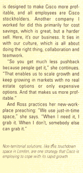 Many firms tackle such workplace concerns with one-size-fits-all standards. Until recently, Cisco did. Garvey, however, decided that was a foolish consistency. One of the things I wanted to change when I came here late last year was trying to impose the San Jose look on everything, she explains, I don’t think that’s appropriate in terms of giving people what they need, Garvey asserts. And each country’s norms and laws are very different in terms of, for example, how far people can be from natural light and their expectations on furniture and ergonomics. So we now have a much larger degree of autonomy and flexibility as to what’s appropriate. The added flexibility also facilitates finding the best workplace solutions for Cisco’s tsunami of acquisitions. We go in and look at what’s best for each acquisition, Ross explains. Some have no space standards or not even good space, with doors for desks, for example. We try to work with them to create a more generic, flexible environment. But we don’t want to not leverage something that’s working. That wised-up flexibility came into play with an acquisition recently relocated in Cisco’s space in Stockley Park Heathrow in London. They really felt strongly about what I’ll call, for lack of a better term, chaos, Ross laughs. So we developed Stockley Park spaces that capture that chaos in a positive way that works for them and is comfortable. Likewise, simple math dictated a departure from conventional workplace wisdom in Seoul. While Cisco’s Seoul office is growing more than 100 percent a year, market vacancy is at 1 percent. The solution was hoteling, but with a nod to nuance. In Seoul’s culture, employees were very uncomfortable without some space of their own, Ross says. So we gave them very small dedicated spaces. And they have a variety of options, like cubicles or quiet rooms, they can use when they’re in the office for a longer time.