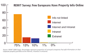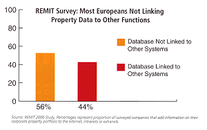 Waller limned the somewhat underdeveloped current state of information technology (IT) use in Europe by citing Real Estate Management IT (REMIT) 2000, a study carried out by E&Y and the International Development Research Council (IDRC), the world's preeminent corporate real estate organization. The E&Y/IDRC study, which spanned 13 European countries, found that more than half of the surveyed corporations do not link their property management functions to any other systems. Roughly 75 percent of respondents were not adding property portfolio data to the Internet, intranets or extranets. And only 6 percent of the companies were using any form of e-commerce in their corporate real estate (CRE) teams.
