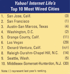 YIL ranked the most wired cities based on four measurements: how many of the city's residents use the Internet, how sophisticated are the residents, how many of the city's businesses are on the Internet, and how much content about the city and its government is available online. Cambridge, Mass.-based Forrester Research, a respected technology research firm, provided YIL with the percentage of households online, the proportion of households connected to the Internet through broadband (or at least have expressed strong interest in it), and the average household expenditure online over a three-month period. In addition to California's stronghold on the broadband usage category, it also topped the online spending category. San Jose, Calif., was No. 1, with an average expenditure of $297 per Internet user over three months; second-place San Francisco rang up $211 in online spending per Internet user. The most households online award, however, goes to Austin-San Marcos, Texas, with 70 percent of households being online. San Jose came in a close second with 68 percent of households online. YIL turned to the Dept. of City and Regional Planning at the University of California at Berkeley as the source for business use on the Net. The department's Matthew Zook conducts extensive analysis of the geographic distribution of Internet use and its relationship to local economies. The measurement used by YIL was the number of domains registered per thousand businesses in a city. California again dominated, ranking seven of the top 10 cities. San Jose and San Francisco led the group with 3,487 and 3,240 domains per thousand businesses respectively. The rest of the top 10 cities for domains per thousand businesses include San Francisco; Los Angeles-Long Beach; Oakland, Calif.; Washington, D.C.; Orange County, Calif.; New York; Oxnard-Ventura, Calif.; San Diego; and Austin-San Marcos, Texas. In an interesting turn of events, however, when YIL editors rated government sites, California fell prey to some of its East Coast counterparts. New York took the No. 1 spot, followed consecutively by Orange County, Calif.; San Francisco; and Washington, D.C. Measurements and rankings such as YIL's wired cities are important to site seekers like U.S. DataPort. "Because the survey covers lifestyle, business and government, it suggests that the most wired cities have both general populations and elected offices who are somewhat Net-savvy and who appreciate what the Net can do," explains Wilmott. "That means that companies looking to hire such people should look in these cities."