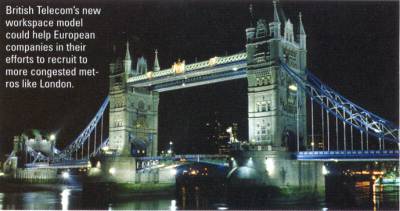 Shepherd feels the search for efficiencies will spread the adoption of restructured work patterns. Says Shepherd: "If we want to increase productivity and shareholder value in the increasingly competitive environment generated by globalization, we'll have to manage people, property and technology as part of one holistic principle. People no longer have offices, they do their jobs at workplaces that move whenever and wherever people can best do their work. And increasingly this is no longer in a traditional office." Wiring up the UK BT has already begun wiring up the British government, which is putting an increasing number of its services online and expects the trend to spread to the private sector in the UK and later to continental Europe.Says Shepherd: "People are looking for service when it suits them not when it suits the government. We're putting government service onto electronic mode so that people can get service whenever they want. We're moving towards 24-hour government with a target for a certain level of transactions electronically by 2002." In the new environment, says Shepherd, the substance of the work output is changing with the way it is getting done. Says Shepherd: "The European and global aspirations of most companies blows the old nine-to-five workstyle out of the water. As recently as the early '90s, people were spending 80 percent of their time in their offices processing paperwork and 20 percent doing knowledge work. Today at the upper levels of advanced multinationals in the UK, this has reversed and the knowledge work is not necessarily being done in an office." Mind over Matter: The BT Concept Shepherd feels the IT revolution will shrink firms' real estate requirements. "If you look at traditional office buildings in Britain, they're 30-40 percent vacant every day, because people are getting their work done somewhere else," says Shepherd. "So today, we have to shift the emphasis to managing people rather than real estate, if we want to get more productivity out of our property. Work is no longer necessarily in an office. It is an activity that can take place anywhere. This is uncomfortable news for people in the property business. But these are the facts."The BT concept emphasizes productivity rather than space. "If you want to get more out of your property, you have to shift the emphasis to managing the people and channel them through the property only when they need it," Shepherd explains. "Therefore, buildings have to be reconfigured to provide a large amount of collaborative space. This means meeting rooms, breakout space and networking cafes, because people are going to do their isolated work elsewhere. Workstations and desks no longer belong to any one person. They are shared." The crisis cell has drastically altered BT's office environment. Shepherd reports: "Six or seven years ago, BT space utilization was 90 percent fixed offices and work stations and 10 percent communal meeting space. Today it's half-and-half. Cellular or individual office space has shrunk to 4 percent. Fifty percent is fixed workstations. The remainder is communal, project or breakout space and cafes or restaurants. This allows you to introduce hot desking." ![]() Reaping the Rewards BT has benefited handsomely as occupancy rates have soared. "When we opened our building in May 1994, we put in 1,250 work stations for 1,250 people," Shepherd says. "Today that building supports 1,800 users for an occupancy rate of 150 percent. And the cost of support per head is reduced dramatically."We have an office base of 74,000, and more than half of them have remote access," he continues. "Two years ago this was 16,000. With the appropriate telephony in place you can operate wherever you want. A virtual telephone number follows me anywhere in the world. You can reach me no matter where I am -- remote access is growing exponentially. Clients who punch clocks are the way of the past." BT has reconfigured the environment for the new century's workplace nomads and preaching this solution to its clients. "We've cabled up our entire system with a network infrastructure so people can work there if they want or need to" Shepherd explains. "In any BT building communal areas are available for everybody. After a meeting I can access a touchdown area or go to the cafe or restaurant and get network access. This maximizes my time management. Given a particular task, we should work in the most appropriate location, whatever and wherever it may be. People can work from home, a library or a boat in the middle of a lake. It's their output that counts." According to Shepherd, the availability of flexible workstyles will diminish the need for relocation of facilities. Says Shepherd: "Relocation costs could shrink or in some cases vanish. The UK Automobile Associations wanted to move out of noisy cramped space. To their surprise, when they closed down the existing facility, they found they didn't need a building because 150 employees could work from their homes." Flexible working style may also cut retraining costs, as employees who must leave for family reasons are kept on the payroll as nomads. "We are making it possible for female employees to continue working from home after pregnancy and thereby keeping access to fully trained personnel," Shepherd says. "We're also recruiting the disabled. This reduces dependence on office facilities." Recruiters, says Shepherd, are delighted. "We wanted to attract a software guru living in Newcastle in the North of England and a competing firm wanted him to move down to the M4 Silicon Valley west of London. We offered exact same pay and benefits but we allowed him to work from Newcastle. He joined BT." Shepherd sees employees benefiting as well as companies. "For office slaves, travel time to work has ballooned," Shepherd reports. "Years ago you rose at seven, left at eight to be at work at nine. Today you rise at six, leave at seven and still arrive at nine. That's four hours p