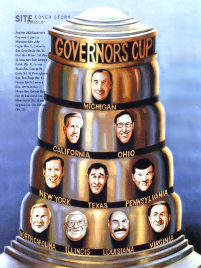 For the fourth year in a row, the state of Michigan claimed the top spot in the magazine's competition for most new and expanded corporate facilities in the United States. And unlike last year, this time the race wasn't even close. With 2,358 new and expanded facilities as defined by the criteria established by Site Selection magazine (see the explanation of our methodology) during calendar year 2000, Michigan emerged as the undisputed champion of the Governor's Cup competition for a record four consecutive years. The amazing streak even surpassed Ohio's incredible three-year run from 1993 to 1995. Michigan's dominance was evident in several key areas, most notably in its lopsided victory over runner-up California, which concluded the 2000 campaign with 1,351 new and expanded facilities. For the Golden State, that was good enough for a second straight finish at No. 2. Michigan's strength was also seen in the fact that it produced the top metro area -- Detroit -- for the fourth consecutive year. The Motor City, with 1,163 new and expanded corporate facilities, easily outdistanced runner-up Chicago, which had 407. The remainder of the top 10 states, following Michigan and California, were Ohio (1,129), New York (1,121), Texas (642), Pennsylvania (632), North Carolina (597), Illinois (558), Louisiana (436) and Virginia (370).