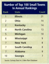 Besides the business climate ranking, North Carolina scored well in the small town business-expansion category, coming in fourth in the number of top 100 small towns category. Indeed, the top two small towns for new and expanded facilities from 1998 to present are in North Carolina -- Mooresville and Statesville (see chart on page 171). And two others -- Sanford and Wilson -- appear in the top 10. Universal Leaf North America, a tobacco processor, is investing $100 million in a new facility in Eastern North Carolina that will employ 1,000 people. And Visotec Automotive Products, a Japanese parts supplier, is creating 200 jobs and investing $50 million in a Morganton facility, to name just two newly announced projects in the state. "While we achieved a certain measure of success in economic development, we know this is no time to rest on our laurels," says Gov. Easley. "That's why in 2001 I worked with our legislature to secure $15 million for our One North Carolina fund -- economic development incentives that can help us spread economic growth into every community in our state. And I've appointed a new Economic Development Board comprised of the finest leaders from across our state to plot a new roadmap to prosperity and growth in 2002."