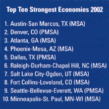 The 8th annual study by Florida-based POLICOM Corp. of 318 U.S. metros found that Austin, Texas, retains its title as the nation's strongest local economy. Edging out runner-up Denver and third-place Atlanta, Austin displayed the power of endurance that is the primary trait of the ranking study, which is based on performance over a 25-year span.