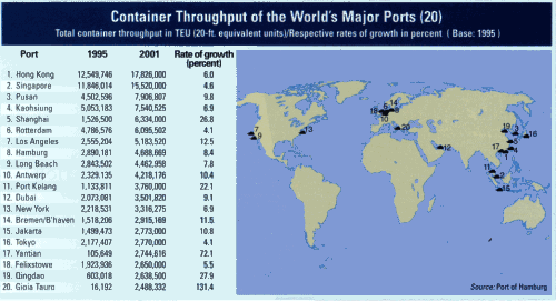 In fact, much of that sediment goes toward the buildup of new landfill for berths, mimicking the island-building that Hong Kong executed for its new airport several years ago. But containerized cargo never complains at the ticket counter. "The cargo demand for the Hong Kong container port in the next 15 years will grow at an annual rate of 5 percent," said Sandra Lee, Hong Kong secretary for economic services, at the Terminal Operations Conference Asia last year, predicting volume of 30 million TEUs in 2010. "Hong Kong is expected to benefit from the continuing growth in Southern China as the main source of cargo for Hong Kong comes from the Pearl River Delta," she said. She also noted that intermodal links and the city-state's airport are crucial connections to the port's operations "A study is being conducted to examine the feasibility of a Container Port Rail Line to support the long-haul freight transport need between Hong Kong and our hinterland," she announced, noting as well the almost 11 percent growth year-to-year in airport cargo shipments, which has sparked the development of a marine cargo terminal and logistics center on the airport's island, both expected to help in tripling the airport's cargo capacity to 9 million tons annually. And what Lee told multinational shippers in June at an international conference in Greece could just as easily apply to other corporate locators. "Hong Kong offers the conducive business environment and facilities to facilitate the development of the shipping industry," she said. "These include a low tax regime, efficient banking services, excellent communications, modern infrastructures, a sound legal system, business-friendly policies, a clean and accountable civil service as well as a highly educated and skilled work force," she said. Felixstowe is the leading port in the U.K., where three new container facilities are being constructed, including a port and distribution hub in London. But those ports and their labor unions, along with those of other European cities, are fighting a European Union directive that would limit the time range on terminal leases, thereby warning away container giants like Maersk Sealand, P&O, ECT and Evergreen. Hamburg, Germany can rightly claim to have been in business since 1189, when the Count of Schauenburg founded it. It reached the status of third-largest in the world by 1912, but World War II saw 80 percent of its facilities destroyed. Today it offers four container terminals and eight multi-purpose terminals that also handle containers. With a handling capacity of 2,500 TEUs or more in less than 24 hours, these terminals ensure that even the biggest container ships can leave Hamburg again in less than a day. Forty-four percent of its container turnover involves Asian trade, with a growing portion accounted for by Scandinavia. In addition to the waterborne vessels, Hamburg can boast to being Europe's largest rail container handler. Germany as a whole will soon benefit from increased port activity in Bremen, and from the $740 million deep sea container terminal at the port of Wilhelmshaven. ![]() Combined, the ports of Long Beach and Los Angeles represent the third busiest container port complex in the world, after Hong Kong and Singapore. And East Asian trade accounts for more than 90 percent of the shipments through the port (according to port officials, 550 million tons of machinery went to China in 2001). Container throughput has increased by more than 175 percent since 1990. Long Beach plans to invest $1.9 billion in capital projects to improve and enlarge its facilities, creating five container terminals of more than 300 acres (121 hectares) each and two other large terminals. The average container terminal operator is charged a guaranteed minimum of $100,000 per acre per year to lease a terminal. In May, the number of imported containers rose to 231,382 TEUs, an increase of 18 percent over May 2001, and exported containers increased to 84,062 TEUs, a gain of 3.6 percent over May 2001, but still behind the number of empty containers shipped out, at 112,589. The leading exports shipped through Long Beach include factory equipment and raw materials such as plastics, chemicals and recycled metal and paper. Antwerp, Belgium and smaller port Zeebrugge in Flanders were significant factors in the choice by Singapore-based terminal operator PSA Corp. to acquire logistics operator Hesse-Noord Natie. The company will grow to operate a combined 22 terminals in both ports, including three container terminals in Antwerp. Earlier this year, the European Distribution Report by Healey & Baker, a part of Cushman & Wakefield, ranked Belgium first of 16 countries in Europe for logistics and distribution operations, based on population density, geographic access, transportation networks, land supply, and costs of land and labor.