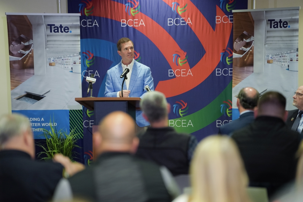 Gov. Andy Beshear speaks at the ceremony announcing Tate’s corporate facility investment in Glasgow, Kentucky.