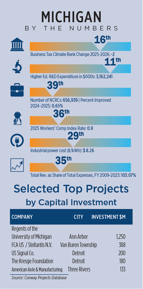 Michigan, which ranked No. 7 overall in Site Selection’s annual Prosperity Cup rankings in 2024 and No. 6 in CNBC’s America’s Top States for Business in 2025, is not only welcoming hyperscalers, but also building out infrastructure and creating jobs. One example of this is evident in Saline Township, southwest of Detroit, where a multibillion-dollar data center will be built as part of OpenAI’s Stargate project in partnership with Oracle and Related Digital.