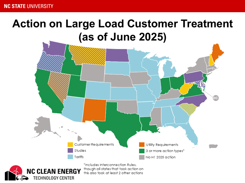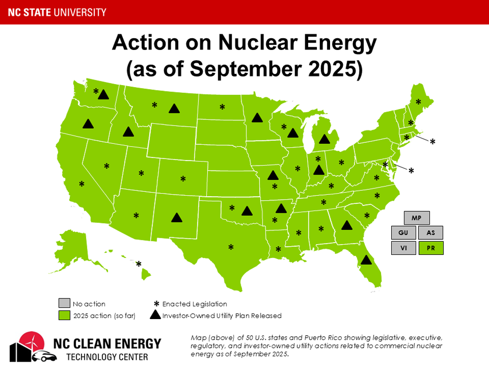 Meanwhile, one of the issues nuclear energy may help solve — unprecedented large-load power demand — was the subject of a late September blog by NCCETC Senior Policy Analyst Rebekah de la Mora entitled “Large Load Customer Treatment: Recent State Action on Load Growth, Data Centers, and Generation Capacity.” The analysis features the map below showing the varied intensity of state actions and a breakdown of specific major actions in more than a dozen states. “Across the first half of 2025, the DSIRE Insight team found 33 states took some sort of action on large load customer treatment,” she writes, “with over 85 discrete actions.”
