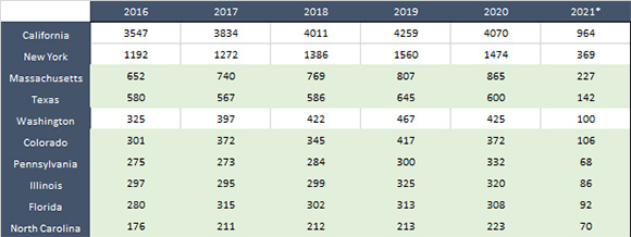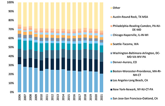 Two report cards released in the past two few weeks. are worth adding to your layers of location analysis. One is the Q1 2021 Pitchbook-NVCA Venture Monitor released two days ago by the National Venture Capital Association in partnership with Silicon Valley Bank and Secfi. Trends include growth in SPACs, a boom in life sciences, and a surge in valuations. The report is made available in PDF and in spreadsheet format, where dozens of tabs of data include time-series deal totals by U.S. region, state and combined statistical area. A few highlights from those sections are shown above. While Silicon Valley still dominates, its stranglehold on VC has loosened.