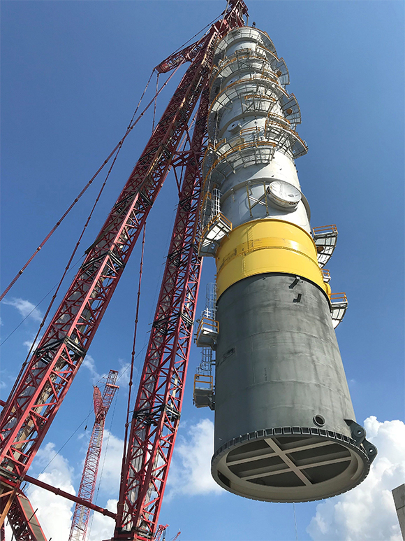 The photo here depicts the site’s quench tower — the largest piece of equipment at Shell Chemical Appalachia LLC’s Pennsylvania Petrochemicals Complex — which was installed in October 2018. “At approximately 2,000 metric tons and 87 meters in height, the tower spent nearly three-and-a-half weeks being towed up the Mississippi and Ohio rivers,” Shell explains. “Upon arrival in Pennsylvania, it was unloaded onto a dock and transported down a newly-created road — both specially-designed to handle the large quench tower.”