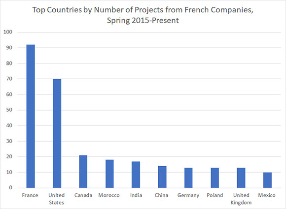 Conway Analytics not only tracks corporate project locations, but the corporations’ location of origin. Since spring 2015, we’ve qualified more than 390 facility investment projects from French companies for our Conway Projects Database, which counts corporate end-user projects that involve at least $1 million in investment, 20 new jobs or 20,000 new sq. ft. of space. The graph shows the leading countries landing these French firms’ projects.