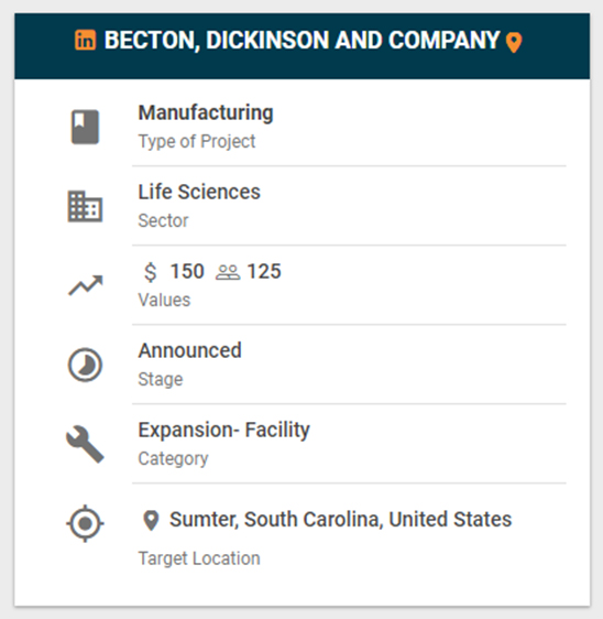 Becton, Dickinson and Company (BD) has announced an expansion of its Sumter, South Carolina, manufacturing facility. The $150 million investment will create 125 new jobs. BD’s facility in Sumter manufactures blood collection devices for the healthcare sector. BD, one of the largest medical technology firms in the world, develops and manufactures a range of products used for medical discovery, diagnostics and delivery of care.