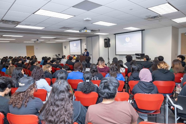 Alberto Urbina, dean of the Material Science and Smart Manufacturing Center of Excellence, speaks to a packed house in May at Houston Community College’s Commitment Signing Day.
