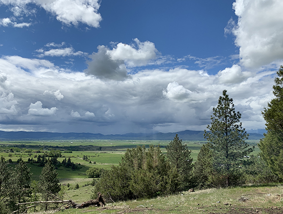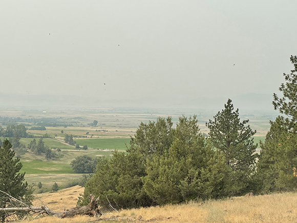 Fires continue to impact many areas of the United States, especially in the Far West. Conway Data Publisher and Director Laura Lyne made these photographs from the same hillside vantage point 400 feet above the floor of the Mission Valley on the slopes of the Mission Mountains between St. Ignatius and Ronan, Montana. The big sky was clear in May and filled with smoke when she photographed it from the same spot last week.. | |