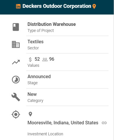 Owner of such brands as Ugg, Teva and Hoka, as well as its namesake Deckers sandal, this California-based company (headquartered in Goleta) is investing in a new distribution center in Mooresville, Indiana. The site joins a national network of facilities that includes distribution centers in Camarillo and Moreno Valley, California; an e-commerce/corporate office in Flagstaff, Arizona; and a customer care/corporate office in Broomfield, Colorado.