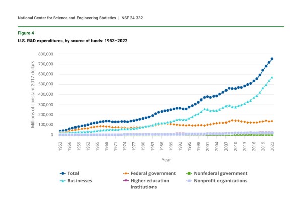 Last week the National Science Foundation released new analysis of R&D investment. Among the findings: between 2000 and 2022, the amount of R&D funded by the business sector has more than doubled when measured in constant dollars (figure 4). In 2000, businesses funded $256 billion in domestic R&D, which increased 123% to an estimated $570 billion in 2022.