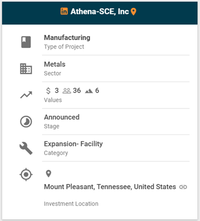 | USAAutomotive supplier Athena-SCE will add 5,800 sq.ft. to its existing facility in Mount Pleasant, Tennessee, with a $3 million investment that will create 36 additional jobs. The facility is intended to be fully operational by the end of 2019.