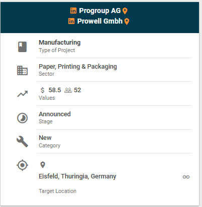 Lead Signal: In March 2018, Conway Analytics delivered a Lead Signal indicating that Germany’s Progroup AG had announced plans to build a new paper factory and up to four corrugated paperboard plants going forward to 2021.