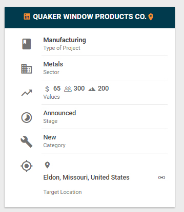 Quaker Window Products recently announced the start of new $65-million, 200,000-sq.-ft. commercial and architectural products production facility in Eldon, Missouri. The new facility will create 300 jobs over the next five to 10 years. Quaker is a family-owned business headquartered in Freeburg, Missouri, and employs more than 950.