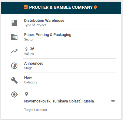 Procter & Gamble announced the building of a new distribution center in Novomoskovsk, Russia. The new $36-million facility will be complete in 2020 and distribute P&G consumer product. The investment is part of a larger, multiple-site strategy to serve the Russian market.