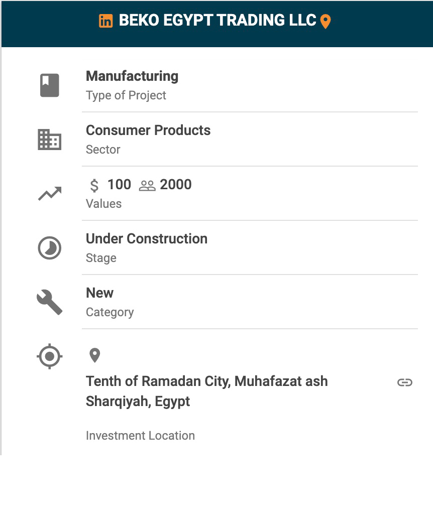 of Ramadan City. Beko is a subsidiary of Turkish conglomerate Arçelik