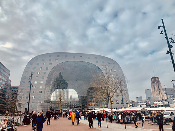 Conway, Inc. Global Director of Training & Events Laura Martin recently made this photo of The Markthal in Rotterdam, Netherlands. The building in the historic Laurenskwartier is referred to by its developers as “a sustainable combination of food, leisure, living, and parking,” with a central market with space for 96 fresh food stalls and shops. A mural on the vaulted interior called “Cornucopia,” by artists Arno Coenen and Iris Roskam, shows “massively enlarged images of food products alongside flowers and insects, in reference to Dutch still-life paintings from the 17th century.” A total of 228 apartments in the structure follow strict Dutch laws regarding natural daylight.